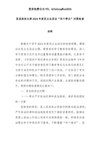 【七哥公文】2025年:某县政协主席2024年度民主生活会“四个带头”对照检查材料+更多免费公文+VX:QiGeGongWen2024+更多免费公文+VX:QiGeGongWen2024