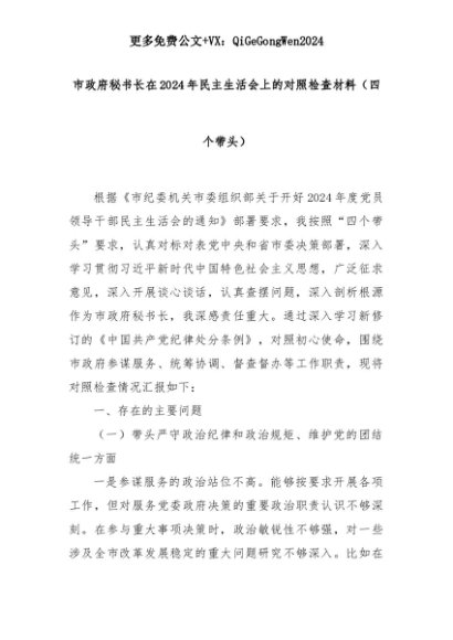 【七哥公文】2025年:市政府秘书长在2024年民主生活会上的对照检查材料(四个带头)+更多免费公文+VX:QiGeGongWen2024+更多免费公文+VX:QiGeGongWen2024