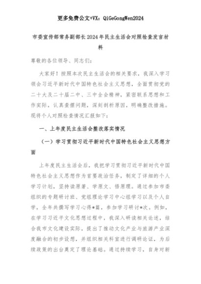 【七哥公文】2025年:市委宣传部常务副部长2024年民主生活会对照检查发言材料+更多免费公文+VX:QiGeGongWen2024+更多免费公文+VX:QiGeGongWen2024