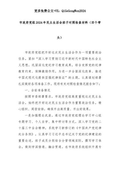 【七哥公文】2025年:市政府党组2024年民主生活会班子对照检查材料(四个带头)+更多免费公文+VX:QiGeGongWen2024+更多免费公文+VX:QiGeGongWen2024