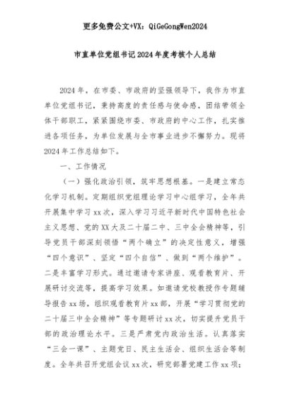 【七哥公文】2025年:市直单位党组书记2024年度考核个人总结+更多免费公文+VX:QiGeGongWen2024+更多免费公文+VX:QiGeGongWen2024