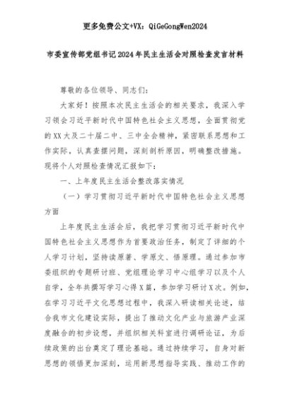 【七哥公文】2025年:市委宣传部党组书记2024年民主生活会对照检查发言材料+更多免费公文+VX:QiGeGongWen2024+更多免费公文+VX:QiGeGongWen2024