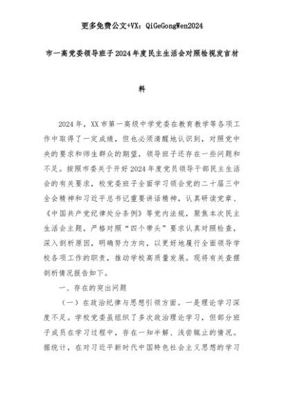 【七哥公文】2025年:市一高党委领导班子2024年度民主生活会对照检视发言材料+更多免费公文+VX:QiGeGongWen2024+更多免费公文+VX:QiGeGongWen2024