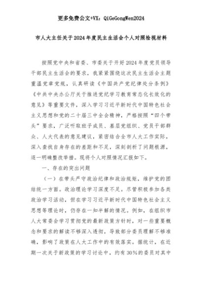 【七哥公文】2025年:市人大主任关于2024年度民主生活会个人对照检视材料+更多免费公文+VX:QiGeGongWen2024+更多免费公文+VX:QiGeGongWen2024