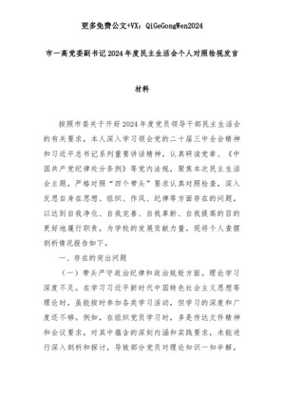 【七哥公文】2025年:市一高党委副书记2024年度民主生活会个人对照检视发言材料+更多免费公文+VX:QiGeGongWen2024+更多免费公文+VX:QiGeGongWen2024