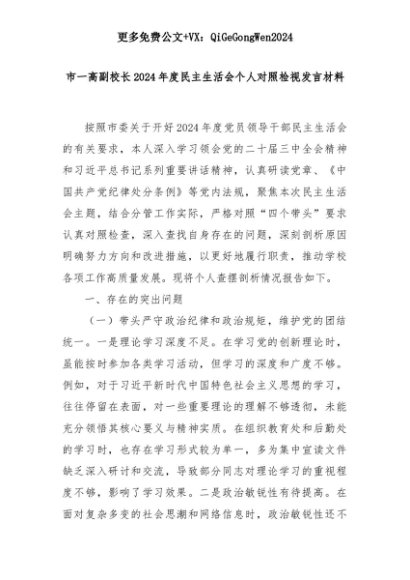 【七哥公文】2025年:市一高副校长2024年度民主生活会个人对照检视发言材料+更多免费公文+VX:QiGeGongWen2024+更多免费公文+VX:QiGeGongWen2024
