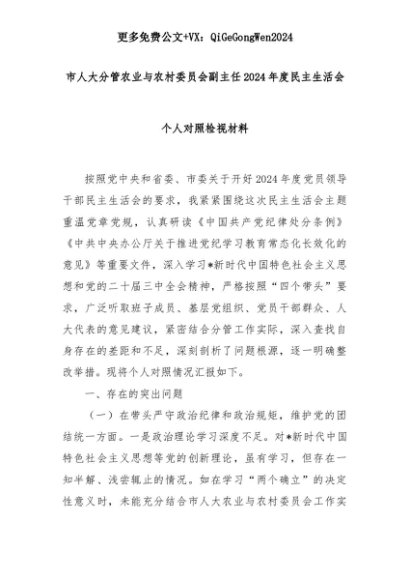 【七哥公文】2025年:市人大分管农业与农村委员会副主任2024年度民主生活会个人对照检视材料+更多免费公文+VX:QiGeGongWen2024+更多免费公文+VX:QiGeGongWen2024