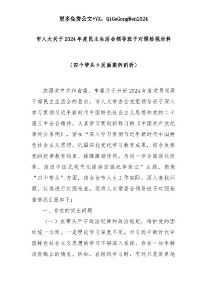 【七哥公文】2025年:市人大关于2024年度民主生活会领导班子对照检视材料(四个带头+反面案例剖析)+更多免费公文+VX:QiGeGongWen2024+更多免费公文+VX:QiGeGongWen2024