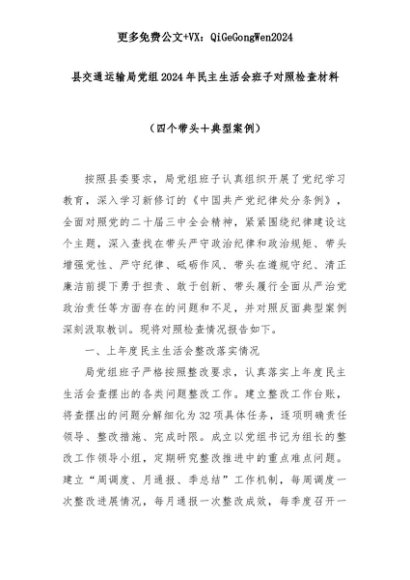 【七哥公文】2025年:县交通运输局党组2024年民主生活会班子对照检查材料(四个带头+典型案例)+更多免费公文+VX:QiGeGongWen2024+更多免费公文+VX:QiGeGongWen2024