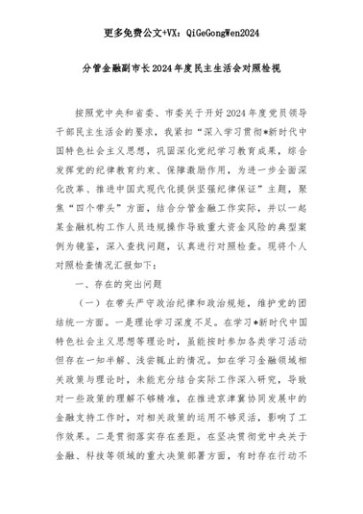 【七哥公文】2025年:分管金融副市长2024年度民主生活会对照检视+更多免费公文+VX:QiGeGongWen2024+更多免费公文+VX:QiGeGongWen2024