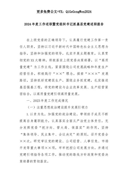 【七哥公文】2025年:2024年度工作述职暨党组织书记抓基层党建述职报告+更多免费公文+VX:QiGeGongWen2024+更多免费公文+VX:QiGeGongWen2024