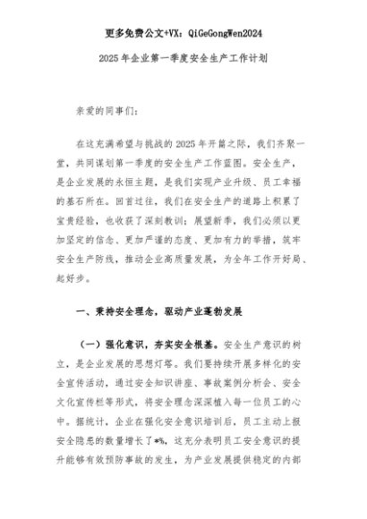 【七哥公文】2025年:2025年企业第一季度安全生产工作计划+更多免费公文+VX:QiGeGongWen2024+更多免费公文+VX:QiGeGongWen2024