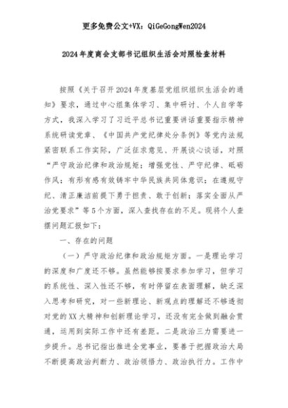 【七哥公文】2025年:2024年度商会支部书记组织生活会对照检查材料+更多免费公文+VX:QiGeGongWen2024+更多免费公文+VX:QiGeGongWen2024