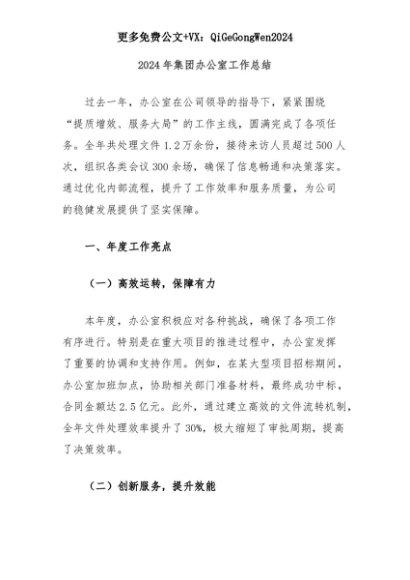 【七哥公文】2025年:2024年集团办公室工作总结+更多免费公文+VX:QiGeGongWen2024+更多免费公文+VX:QiGeGongWen2024