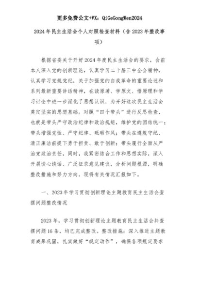 【七哥公文】2025年:2024年民主生活会个人对照检查材料(含2023年整改事项)+更多免费公文+VX:QiGeGongWen2024+更多免费公文+VX:QiGeGongWen2024