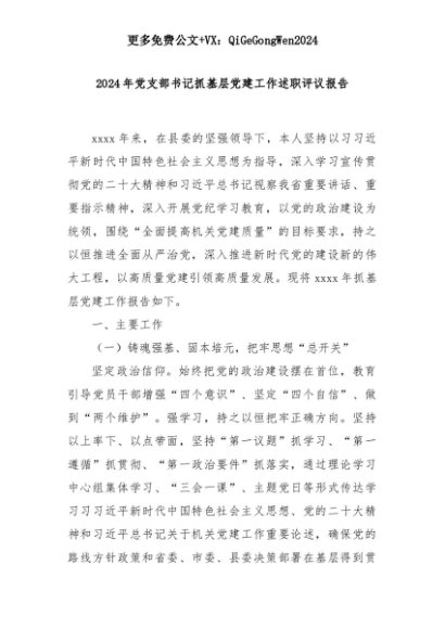 【七哥公文】2025年:2024年党支部书记抓基层党建工作述职评议报告+更多免费公文+VX:QiGeGongWen2024+更多免费公文+VX:QiGeGongWen2024