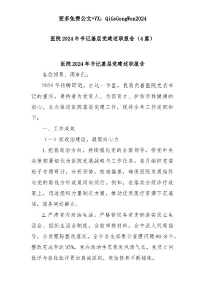 【七哥公文】2025年:(4篇)医院2024年书记基层党建述职报告+更多免费公文+VX:QiGeGongWen2024+更多免费公文+VX:QiGeGongWen2024