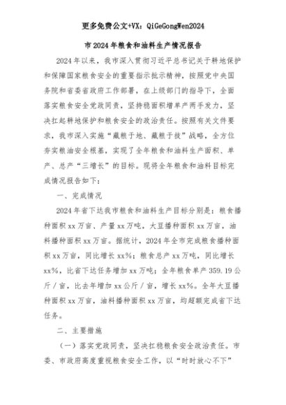 【七哥公文】2025年:市2024年粮食和油料生产情况报告+更多免费公文+VX:QiGeGongWen2024+更多免费公文+VX:QiGeGongWen2024