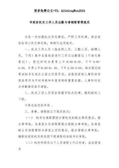 【七哥公文】2025年:市政协机关工作人员出勤与请销假管理规定+更多免费公文+VX:QiGeGongWen2024+更多免费公文+VX:QiGeGongWen2024