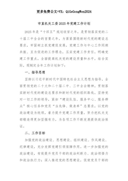 【七哥公文】2025年:市直机关工委2025年党建工作计划+更多免费公文+VX:QiGeGongWen2024+更多免费公文+VX:QiGeGongWen2024