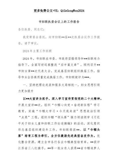 【七哥公文】2025年:市妇联执委会议上的工作报告+更多免费公文+VX:QiGeGongWen2024+更多免费公文+VX:QiGeGongWen2024