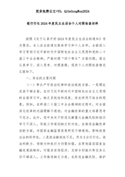 【七哥公文】2025年:银行行长2024年度民主生活会个人对照检查材料+更多免费公文+VX:QiGeGongWen2024+更多免费公文+VX:QiGeGongWen2024