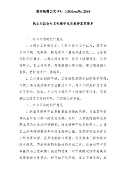 【七哥公文】2025年:民主生活会对其他班子成员批评意见清单+更多免费公文+VX:QiGeGongWen2024+更多免费公文+VX:QiGeGongWen2024