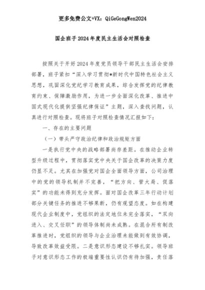 【七哥公文】2025年:国企班子2024年度民主生活会对照检查+更多免费公文+VX:QiGeGongWen2024+更多免费公文+VX:QiGeGongWen2024