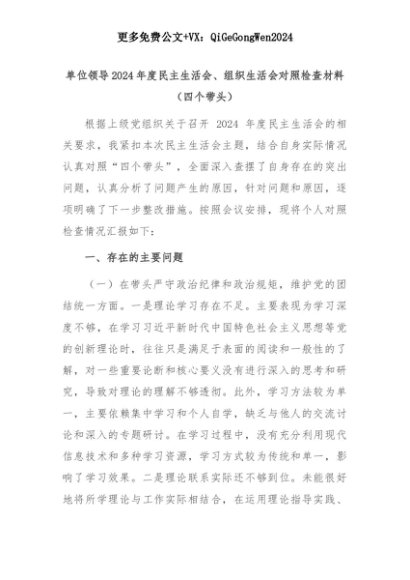 【七哥公文】2025年:单位领导2024年度民主生活会、组织生活会对照检查材料(四个带头)+更多免费公文+VX:QiGeGongWen2024+更多免费公文+VX:QiGeGongWen2024