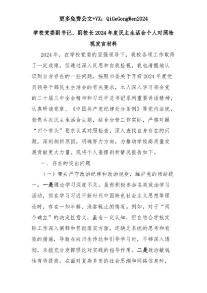 【七哥公文】2025年:学校党委副书记、副校长2024年度民主生活会个人对照检视发言材料+更多免费公文+VX:QiGeGongWen2024+更多免费公文+VX:QiGeGongWen2024
