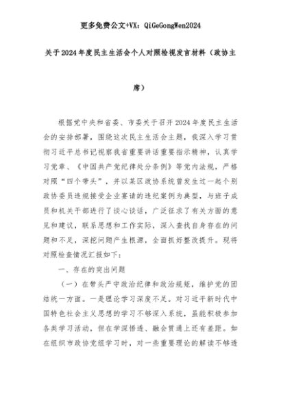 【七哥公文】2025年:关于2024年度民主生活会个人对照检视发言材料(政协主席)+更多免费公文+VX:QiGeGongWen2024+更多免费公文+VX:QiGeGongWen2024