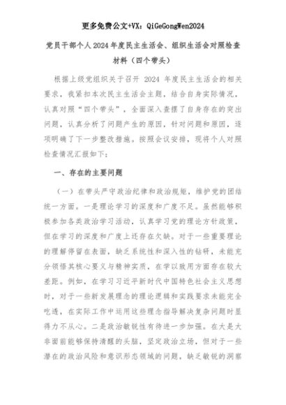 【七哥公文】2025年:党员干部个人2024年度民主生活会、组织生活会对照检查材料(四个带头)+更多免费公文+VX:QiGeGongWen2024+更多免费公文+VX:QiGeGongWen2024