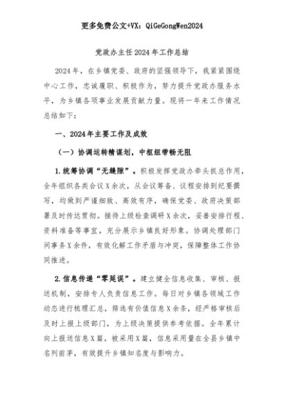 【七哥公文】2025年:党政办主任2024年工作总结+更多免费公文+VX:QiGeGongWen2024+更多免费公文+VX:QiGeGongWen2024