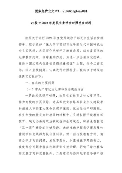 【七哥公文】2025年:xx校长2024年度民主生活会对照发言材料+更多免费公文+VX:QiGeGongWen2024+更多免费公文+VX:QiGeGongWen2024