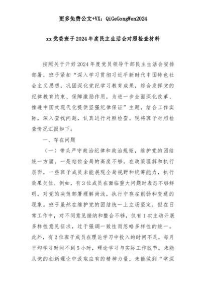 【七哥公文】2025年:xx党委班子2024年度民主生活会对照检查材料+更多免费公文+VX:QiGeGongWen2024+更多免费公文+VX:QiGeGongWen2024