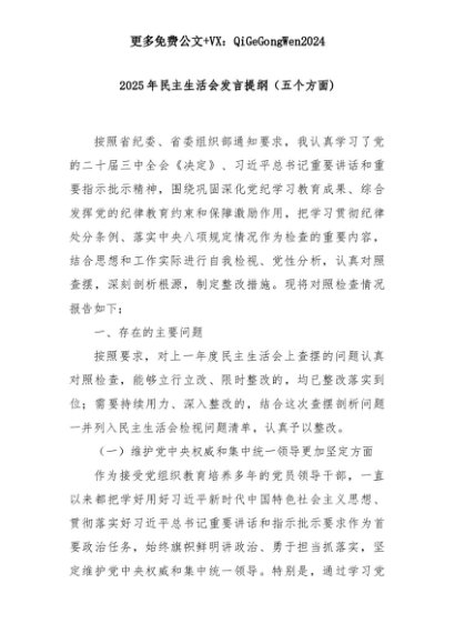 【七哥公文】2025年:2025年民主生活会发言提纲(五个方面)+更多免费公文+VX:QiGeGongWen2024+更多免费公文+VX:QiGeGongWen2024