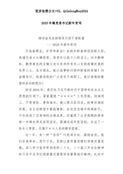 【七哥公文】2025年:2025年镇党委书记新年贺词+更多免费公文+VX:QiGeGongWen2024+更多免费公文+VX:QiGeGongWen2024