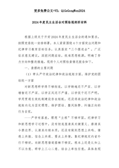 【七哥公文】2025年:2024年度民主生活会对照检视剖析材料+更多免费公文+VX:QiGeGongWen2024+更多免费公文+VX:QiGeGongWen2024