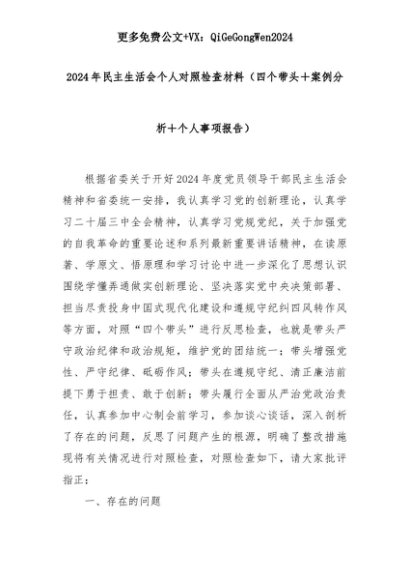 【七哥公文】2025年:2024年民主生活会个人对照检查材料(四个带头+案例分析+个人事项报告)+更多免费公文+VX:QiGeGongWen2024+更多免费公文+VX:QiGeGongWen2024