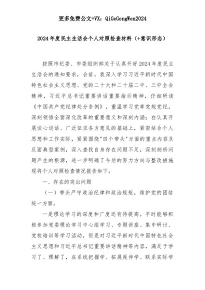 【七哥公文】2025年:2024年度民主生活会个人对照检查材料(+意识形态)+更多免费公文+VX:QiGeGongWen2024+更多免费公文+VX:QiGeGongWen2024