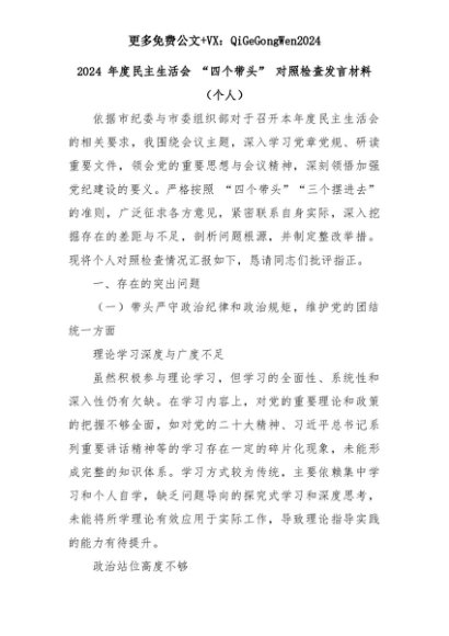 【七哥公文】2025年:2024 年度民主生活会 “四个带头” 对照检查发言材料(个人)+更多免费公文+VX:QiGeGongWen2024+更多免费公文+VX:QiGeGongWen2024
