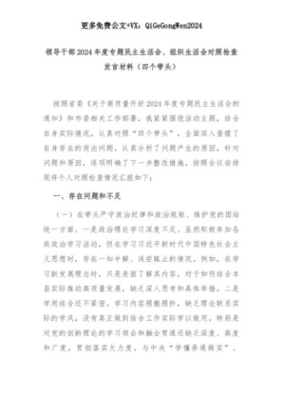 【七哥公文】2025年:领导干部2024年度专题民主生活会、组织生活会对照检查发言材料(四个带头)+更多免费公文+VX:QiGeGongWen2024+更多免费公文+VX:QiGeGongWen2024