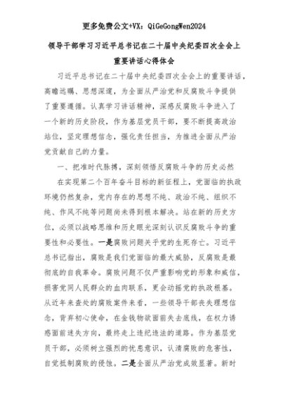 【七哥公文】2025年:领导干部学习习近平总书记在二十届中央纪委四次全会上重要讲话心得体会+更多免费公文+VX:QiGeGongWen2024+更多免费公文+VX:QiGeGongWen2024