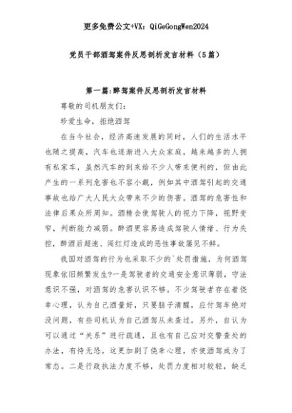 【七哥公文】2025年:(5篇)党员干部酒驾案件反思剖析发言材料+更多免费公文+VX:QiGeGongWen2024+更多免费公文+VX:QiGeGongWen2024