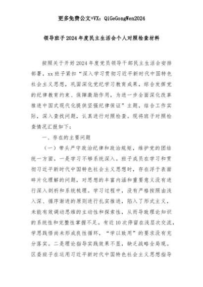 【七哥公文】2025年:领导班子2024年度民主生活会个人对照检查材料+更多免费公文+VX:QiGeGongWen2024+更多免费公文+VX:QiGeGongWen2024