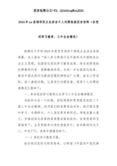 【七哥公文】2025年:2024年xx县领导民主生活会个人对照检查发言材料(含党纪学习教育、三中全会情况)+更多免费公文+VX:QiGeGongWen2024+更多免费公文+VX:QiGeGongWen2024