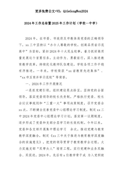 【七哥公文】2025年:2024年工作总结暨2025年工作计划(学校—中学)+更多免费公文+VX:QiGeGongWen2024+更多免费公文+VX:QiGeGongWen2024
