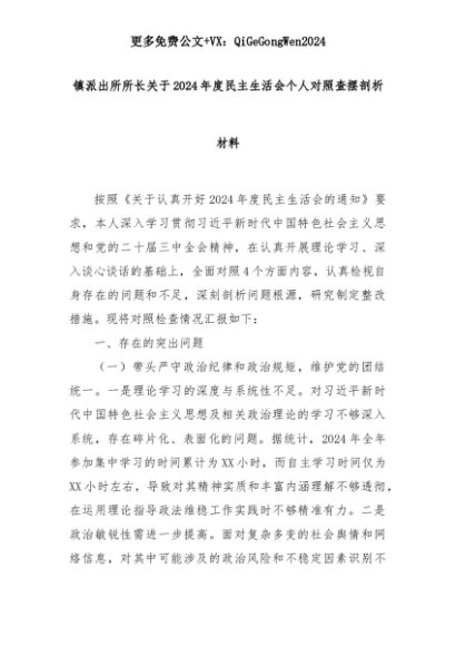 【七哥公文】2025年:镇派出所所长关于2024年度民主生活会个人对照查摆剖析材料+更多免费公文+VX:QiGeGongWen2024+更多免费公文+VX:QiGeGongWen2024