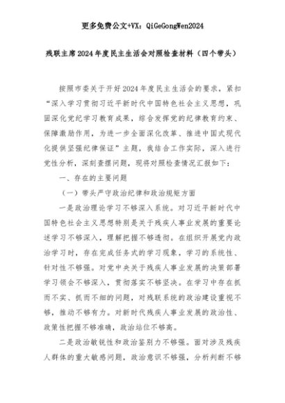 【七哥公文】2025年:残联主席2024年度民主生活会对照检查材料(四个带头)+更多免费公文+VX:QiGeGongWen2024+更多免费公文+VX:QiGeGongWen2024