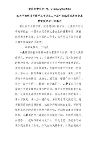【七哥公文】2025年:机关干部学习习近平总书记在二十届中央纪委四次全会上的重要讲话心得体会+更多免费公文+VX:QiGeGongWen2024+更多免费公文+VX:QiGeGongWen2024